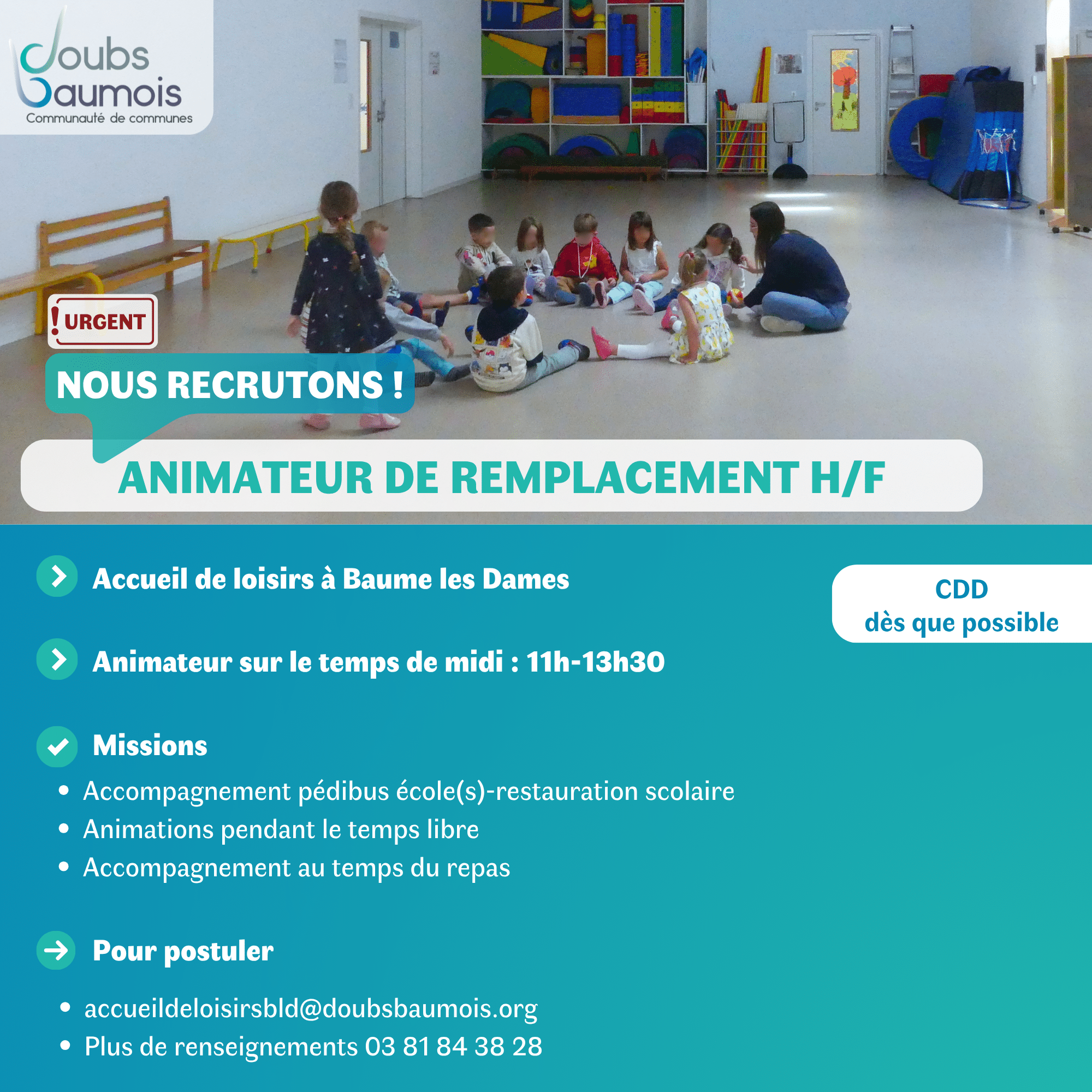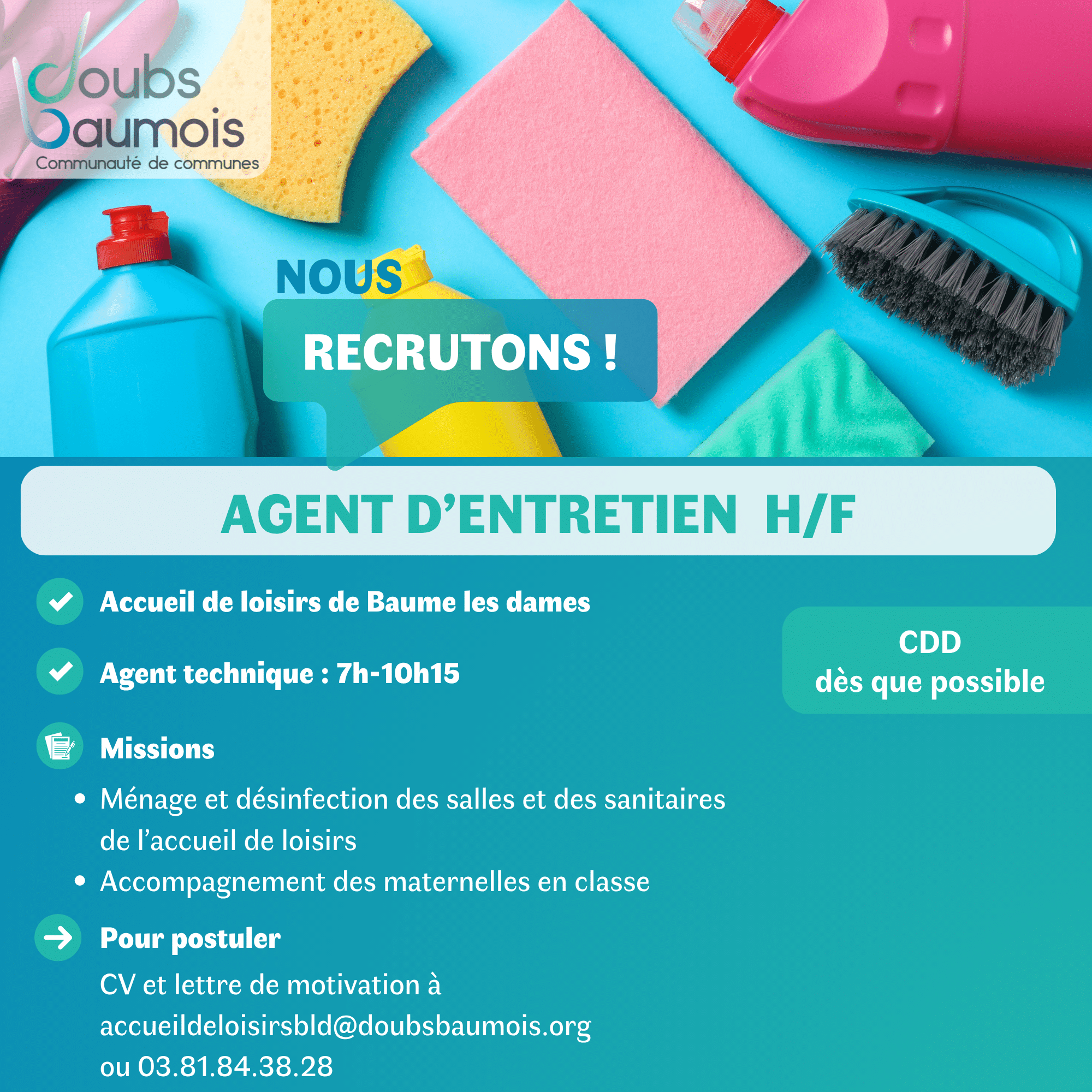 La CCDB recherche en permanence des agents pour des remplacements en tant qu’ATSEM, agent d’entretien, agent d’animation…